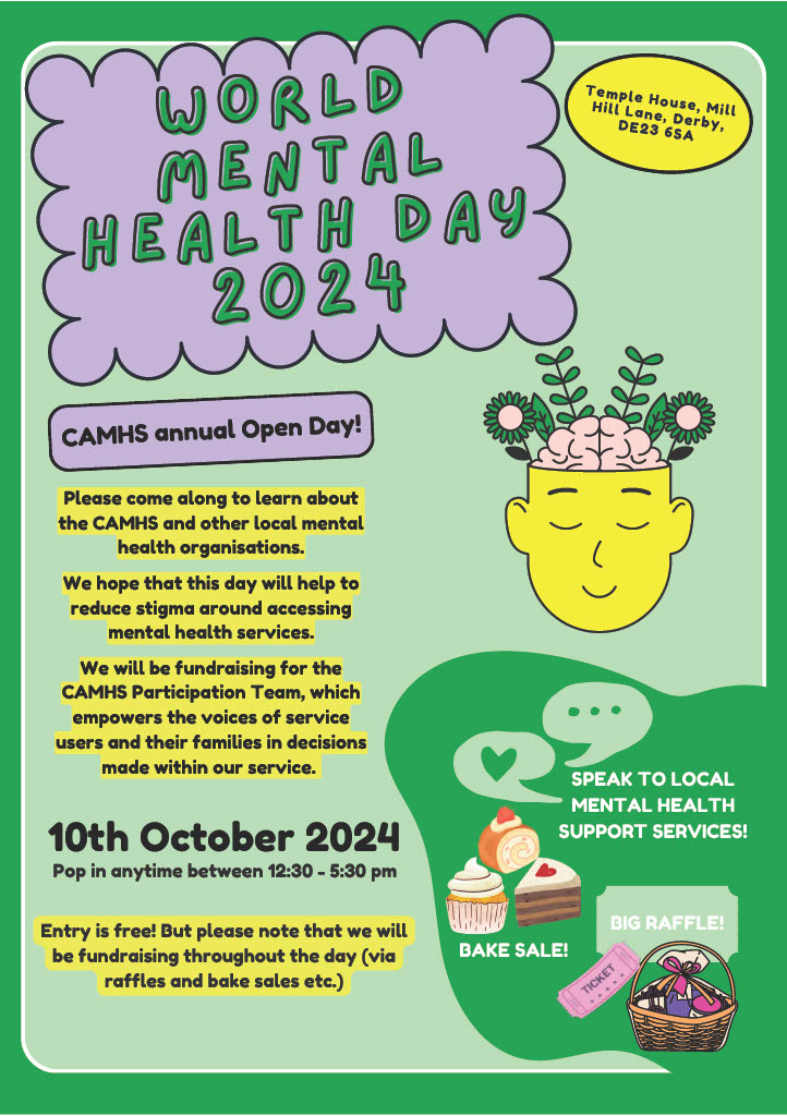 As part of World Mental Health Day (10 October), the local Child and Adolescent Mental Health Service (CAMHS) is once again hosting an open day event at Temple House in Derby so young people and their families can learn more about CAMHS and other local mental health organisations – and this year, the service are also fundraising to help raise money for some of their patient activities and support groups.